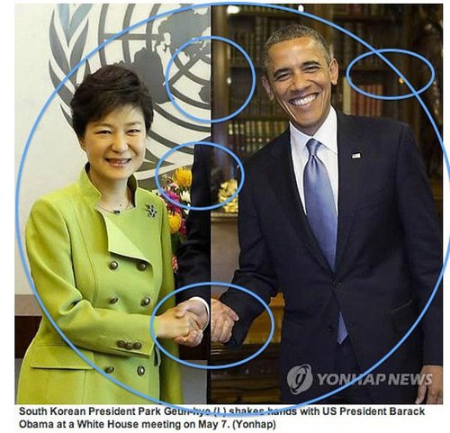 美國《赫芬頓郵報》8日報道稱,韓國聯合通訊社(簡稱韓聯社)的一篇報道中,合成了奧巴馬與樸槿惠的“握手照”,并說明這張照片拍攝于當地時間7日,照片中,美國總統奧巴馬與到訪的韓國總統樸槿惠在白宮握手。